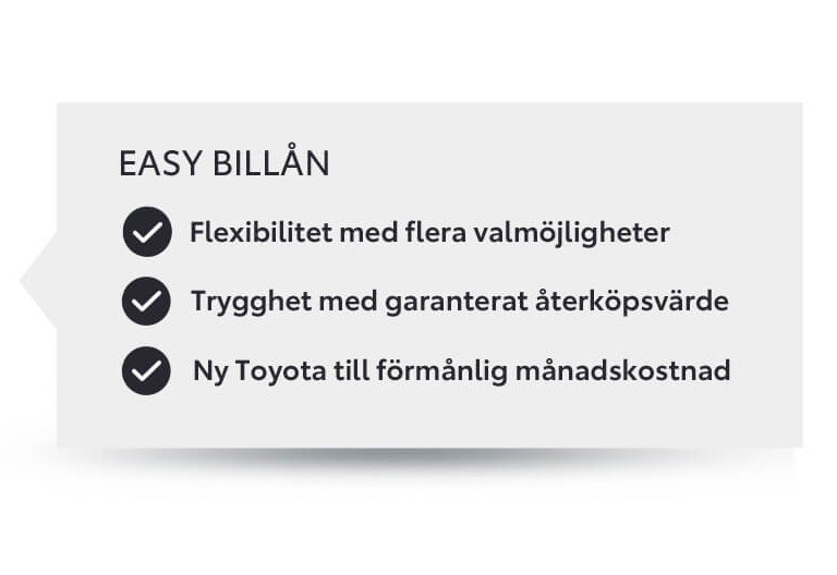 Toyota Easy Billån är ett billån med garanterat återköpsvärde som både ger dig lägre månadskostnad och möjligheter till ett enklare, tryggare och mer flexibelt bilägande.